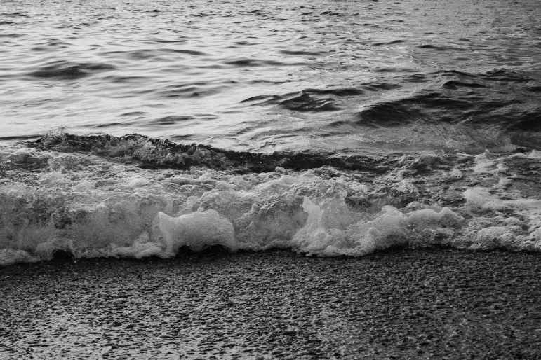 The waves sweep in, tumble over themselves and slip away. I try to find a landmark. Sea-foam surges; pebbles scramble around our feet, then fall still. I can’t find anything I can recognize or latch onto.